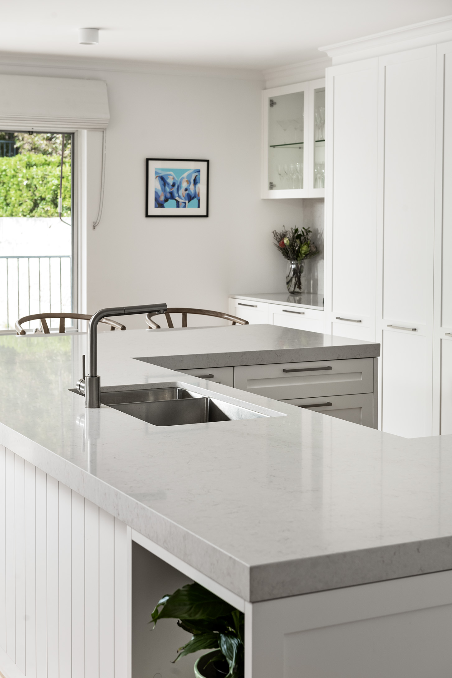 Hope residence, located in the leafy Western Suburbs, a renovation that takes place in the main focal hub of the home. Using crisp whites, panelled fronts and subtle grey benchtops lifts this Hamptons inspired design to an attractive open living plan.