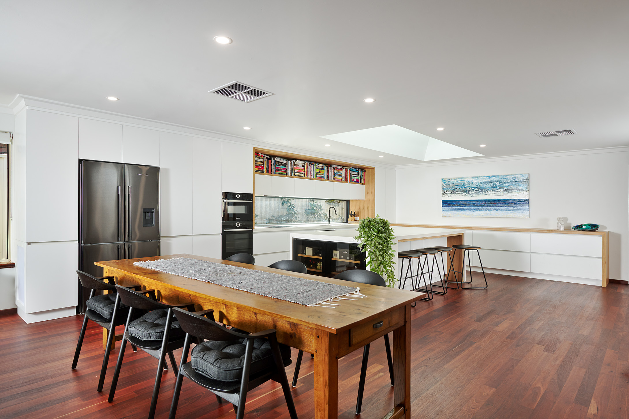 The desired bookshelf, the natural timber highlighted featured on the rear of the island, and the oversized solid timber statement bench stretching to the rear of the room breaks up the large interior into planned dedicated open spaces for the family. The dining integrated into the kitchen and moving into the living allows interation between one another.